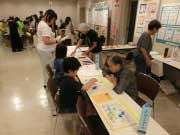 みんなの健康展は、メイシアターの改修や新型コロナウイルスの感染拡大の影響で、事業の縮小を余儀なくされた期間が続きましたが、今年度は久しぶりにメイシアターの中ホールに加えて、1階フロア全面で各団体の展示ブースとイベントステージを設けることができました。ブースでは皆様熱心にスタッフのお話に耳を傾けておられました。