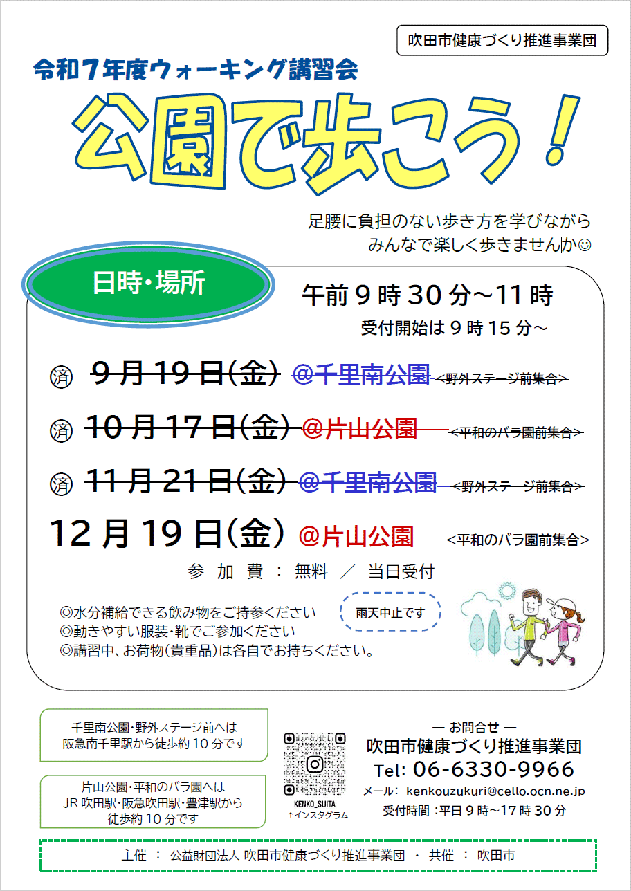 12月とは思えない暖かな太陽の光を浴びながら、片山公園で令和7(2025)年、最後の「公園で歩こう!」を開催しました。12月だから少ないかなと思っていましたが、「市報を見た」と初めてご参加くださる方も多く、笑いながら楽しくそして真剣にウォーキングやストレッチ、歩くための筋力トレーニングに取り組んでくださいました。ご参加くださった皆さま、有難うございました。 1月と2月はお休みをいただきます。次回は、千里南公園で令和8年3月13日金曜日の9時30分~11時です。野外ステージ前にお集まりください。申込みは不要です。 |